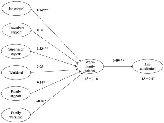 As regards other direct effects, life satisfaction was positively predicted by work–family balance (β = 0.69, p < 0.001).