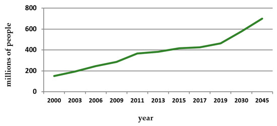 Estimated number of adults with diabetes (in millions) since 2000 to 2045. Source: IDF Diabetes Atlas editions [8].