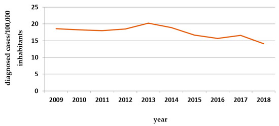 Number of cases diagnosed in Portugal with “diabetic foot” per 100,000 inhabitants (hospital admissions) since 2009 to 2018. Source: INFARMED [13].