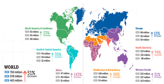 According to the International Diabetes Federation (IDF), for 2019, both forms of diabetes caused 4.2 million deaths, and there are around 463 million adults aged between 20 and 79 years diagnosed with the disease, a number that will likely increase to 700 million by 2045 (Figure 1) [8,9]. Furthermore, the disease is likely to be under-represented, as there are suggestive data indicating that 1 in 3 patients are under-diagnosed [8].