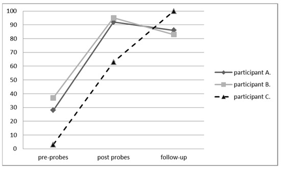 Figure 1. Percentages of positive behavior intervals of the three participants. Probes: 5 min divided in 10 s intervals; follow-up 30 days after training; number of sessions to acquire mastered criterion 48, 22, 9, respectively, for the three participants A, B, and C. The analysis of frequency differences applying a chi-square statistic is 13.372. The p-value is 0.001. The results are significant at p < 0.05. Data analysis was performed using the R package Version 1.15.