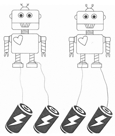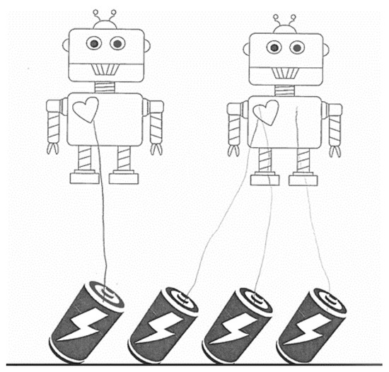 The mathematics sharing stories were developed similar to Cwikla’s [34] study, where the child was asked to show or illustrate how to share various items with other objects fairly. There were nine questions in total. The experimenter read each question to the child and then asked them to draw on the paper showing how they would share the items. Questions were similar to the following: “Here we have two robots and four batteries. Show me how you would share all of the batteries so that each robot gets the same amount.” The child would then draw a line connecting the batteries to the robots. An example of a correct response is shown in Figure 1 and an incorrect response is shown in Figure 2. The child’s response shown in Figure 1 would receive a score of 8, meaning that all of the batteries were distributed correctly and fairly, and no partitions were necessary. The child’s response shown in Figure 2 would receive a score of 5, as s/he split up wholes correctly, but not fairly. The question (distribute four batteries to two robots) only regarded wholes; therefore, an 8 is the highest score one could make on this question. A 9 or 10 would have not been achieved because no extra partitions were necessary, unlike other items that involve partitioning objects and splitting the parts amongst people or other objects (See Figure 1 and Figure 2).