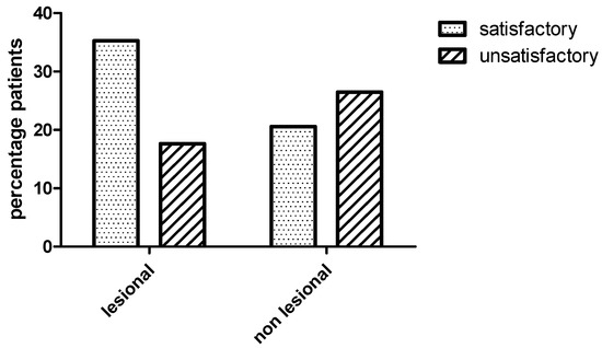 After one-year follow up, 19/34 (55.8%) of the patients had a satisfactory seizure outcome (Engel class I–II). In this arm, the highest frequency was occupied by cases classified within class I, 16/19 (84, 2%). Engel scores follow-up for this group were as follows: 9 class IA, 5 IB, 2 IC and 3 II. On the other hand, Engel scores follow-up for unsatisfactory seizure outcome (Engel class III–IV) patients was described as 7 class III and 8 class IV. In the current study, there was no difference in the clinical outcome between lesional and non lesional ExTLE patients, p = 0.15, Fischer exact test Figure 2. Of the 19 patients who were seizure-free, seven had no macroscopic lesion in MRI.