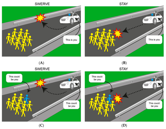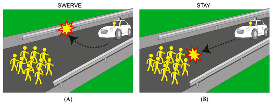 Perhaps one of the most intriguing empirical findings (see [60]) reveals utilitarian preference inconsistencies within the same people, where people do not want to own the AV that they perceive to be the most morally appropriate. Accordingly, in study 3 of Bonnefon et al. [60], the experimenters presented participants with a variation of a scenario where they had to imagine themselves inside an AV that is about to crash into a group of 10 pedestrians in the road. The participants were told that the AV could be programmed to swerve off to the side of the road where it will impact a barrier and kill them (sparing the 10 pedestrians) or it could be programmed to stay on its current path and kill the 10 pedestrians (sparing themselves; see Figure 1 for a visual depiction of this scenario). Participants were then asked to rate which AV they perceived to be most moral, as well as to indicate their willingness to buy each AV. Bonnefon et al. [60] found that participants judged utilitarian AVs as the most morally appropriate for societal use, yet they wanted to buy passenger-protective models themselves. Therefore, moral preferences towards AVs depend upon the decision-maker’s role: as citizens, people want prosocial utilitarian AVs but as consumers, people opt for passenger-protective models [56], exemplifying a social dilemma.