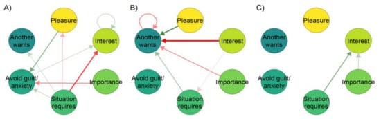 Relationships between a single participant’s motivational variables varying in time (time-varying autoregressive model). Networks represent relationships between variables around the time points where 10% (panel (A)), 50% (B) and 90% (C) of the study had been completed. An arrow from one variable to the next means the former predicts the latter at the next time point; green for positive and red for negative correlation. If a stationary model was used, all periods would be collapsed to a single result, creating the impression that the relationships were homogeneous across the study period. Although this temporal variability can be due to, e.g., changes in how the participant answers the questions (boredom, shifting perception of the items, etc.), or poor reliability of the measures, complexity theory would also guide us to expect that in very concrete reality, the direction and strength of relationships can shift over time and differ based on the state a person resides in. As an example, the relationships between motivational variables during behaviour change initiation phase, may differ from the relationships during the maintenance phase.
