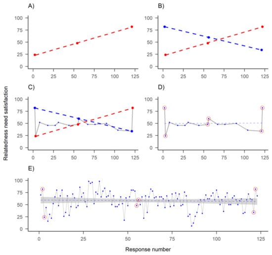 One of the time series recorded by the participant featured in previous figure. Dots indicate answers to a visual analog scale question on their relatedness need satisfaction, as posited by self-determination theory (y-axis), measured on different time points (x-axis): (A) Measuring three time points—representing conventional evaluation of baseline, post-intervention and a longer-term follow-up—shows a decreasing trend; (B) Same measurement on slightly different days shows an opposite trend; (C) Measuring 15 time points instead of 3 would have accommodated both observed “trends”; (D) New linear regression line (dashed) indicates stationarity and (E) Including all 122 time points, a more complete picture of the dynamics emerges.