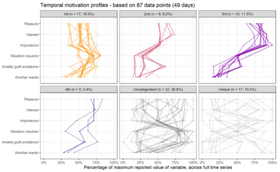 An in-depth walkthrough of the analysis with code is provided in the supplementary website (see section available online: https://git.io/JfLs3 (accessed on 1 May 2021)), and a tutorial is available in [130], hence we will be brief in the background and focus on the results. Data for the demonstration below comes from a single participant, who at each time point, completed six questions about their self-determined motivation. A more detailed exposition of the data is found at the supplementary website (see section available online: https://git.io/JfLmQ (accessed on 1 May 2021)).