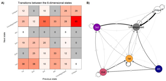 We can collapse the information in Figure 4 to the percentages with which one state follows another, demonstrating a transition network. It answers the question “If you are in state x, what is the probability of transitioning to state y?” Figure 6 (panel A) depicts the relative frequencies with which each state precedes the others. If the system displays linear dynamics, then the matrix should be roughly symmetrical, with similar values observed above and below the diagonal drawn from the bottom left cell to the top right cell. Panel B of Figure 6 presents the same information as a network.