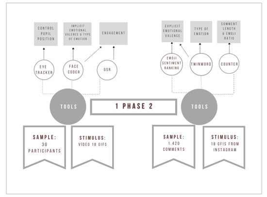 In order to test these hypotheses, this research was divided into two phases focused on inferring the emotional valence derived from a selection of GIFs posted on Instagram (Figure 1). In the first phase, techniques from consumer neuroscience or neuromarketing were applied to obtain a measure of implicit emotional valence and engagement. The second phase complemented the first by analyzing the explicit emotional valence based on the semantic analysis of the comments on each GIF. Finally, a comparison was made between the emotional data obtained implicitly and explicitly.