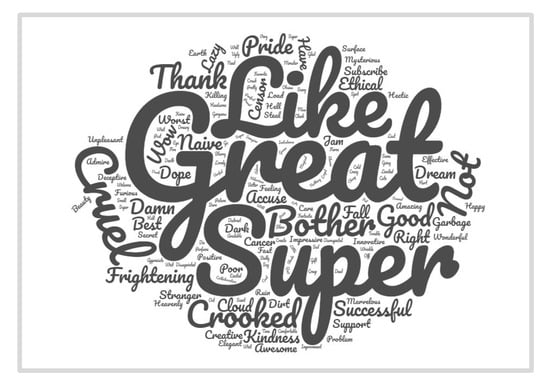 The Twinword API (https://www.twinword.com/; accessed on 31 May 2021) was used. This natural language processing (NLP) interface, based on the Python programming language, detects the intentionality of sentences and paragraphs. The measure it provides is the overall score of the analyzed text. Thus, values lower than −0.05 are considered negative, values higher than 0.05 are considered positive, and all values in between are considered neutral. In addition, thanks to this application, a list of the most emotionally charged words and adjectives was obtained from the comments.