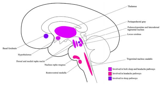 From an anatomical point of view, there are structures where pathways of sleep and headache cross [], including the thalamus, hypothalamus, locus coeruleus, and periaqueductal gray [,,,]. Figure 1 presents the structures that are proposed to underlie comorbid conditions of sleep disorders and headaches []. Therefore, studying how these structures function [] when headaches and sleep disorders coexist can help us to understand the underlying mechanisms.