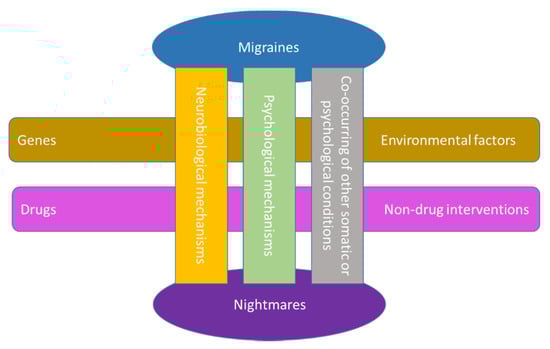 Chronic headaches are comorbid with several disorders, one of which is sleep disorders. Nightmares and migraine are two distinct entities from both disorder groups (i.e., headaches and sleep disorders). Evidence from the literature demonstrates that nightmares sometimes accompany migraine, and this link has been proposed as a result of number of factors that affect both migraine and nightmares, for example, various stressors. Hence, an investigation of their interaction can help us to identify common neurobiological or psychological pathways and the effects of nonpharmacological interventions and optimal pharmacological agents. Comorbid factors and the roles of environmental and genetic factors can also be studied. Figure 2 depicts the proposed link between nightmares and migraine and the potential factors influencing this link.