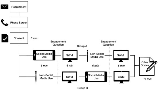 The use of social media has steadily increased over the past decade. It has become a ubiquitous aspect of everyday living and is rapidly expanding [1]. In a recent study, students have been found to use certain platforms to differing degrees and for different purposes, based on their gender, personality, and age [2]. Furthermore, there was an association between disordered social media usage, specifically on Snapchat, Instagram, and Facebook (among other platforms), and the desire felt by users to socialize and present themselves as more popular [2]. Younger people, in particular, are entering a phase where social media is seen as not only a part of life but also life itself; this perception has dramatically accelerated during and even beyond the COVID-19 pandemic [3]. The literature on this all-pervasive technology is relatively recent, and there is expanding interest among researchers concerning the impact of such technology on society’s general wellbeing. Of particular interest among researchers, parents, and health professionals is the impact of social media on cognitive function [4], educational achievement [5], and mental wellbeing, particularly among the younger generation [6]. However, most work consists of correlation and self-reporting studies and lacks experimental evidence.