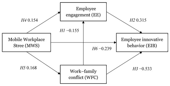 There is little direct literature that we can refer to regarding the effect of mobile workplace stress on employee innovative behavior. The existing studies discussed the impact on employee innovation behavior more in terms of mobile work technology. Kim and Shin (2015) [52] examined the impact of a smartwork environment on organizational commitment and innovation behavior and found that a smartwork environment did not have a significant impact on organizational commitment, but the IT complexity and security risks of a smartwork environment had a positive impact on innovation behavior. We analyzed the main reasons for this: first, their study was conducted in 2015, when the mobile workplace was more of a novelty and challenge for many people rather than a stressor as it is now, and second, they chose a sample from the global financial service industry (GFSI), which is too industry specific. Our study focuses on mobile workplace stress, as we make bold assumptions. When the use of a mobile workplace changes from a novelty to programmed work, the “anytime and anywhere” structure will increase the burden of employees and turn into stress, which will eventually reduce the motivation of employees to innovate. Furthermore, the mobile workplace has disrupted employee home life and has changed the way they share knowledge and information, causing a direct impact on employee innovative behavior. When the effects of the factors are considered together, work–family conflict and employee engagement could mediate the process by which mobile workplace stress affects employee innovation. Accordingly, we predicted: