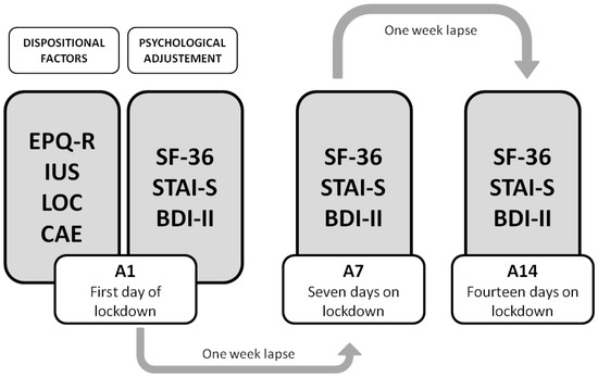 After seven days (A7) and two weeks (A14) of lockdown, the participants were asked to again answer the STAI-State (STAI-S), BDI-II, and SF36 (see Figure 1 for better comprehension of the procedure).