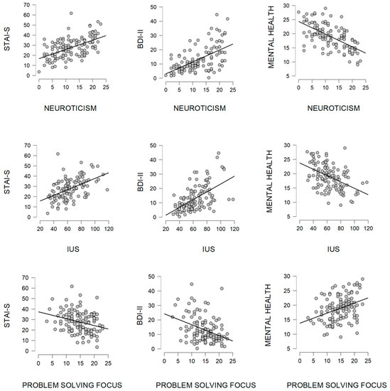 Significant associations among the mean scores of STAI-S, BDI-II, and SF-36 scales obtained during the two-week period and the scores of the individual dispositional factors are reported in Table 1. Dispersion graphs for the most prominent associations are provided in Figure 2. There are five dispositional factors (Neuroticism (NEUR.), Extraversion (EXTR.), Intolerance of Uncertainty (IUS), Problem Solving Focus (PSF), and Negative Autofocus (NA)) that showed consistent associations with anxiety, depression, and the self-perceived health scales. For three of them (NEUR., IUS, and NA) the associations could be considered moderated (all |rs| > 0.4 except for those related to Role-Emotional), meanwhile for the remaining two (EXTR. and PSF) the associations should be considered significant but weak. Furthermore, there are two different patterns of association that could be clearly identified: on one hand, NEUR., IUS, and NA showed a positive association with the STAI-S and BDI-II scores, whereas inversely they showed a negative association with the SF-36 scales. On the other hand, EXTR. and PSF showed the opposite pattern: negative associations with the STAI-S and BDI-II scores along with positive associations with the SF-36 scales are observed. It is important to point out that all the dispositional factors mentioned showed a weaker association with the SF-36 Role-Emotional scale than with the rest of the variables.