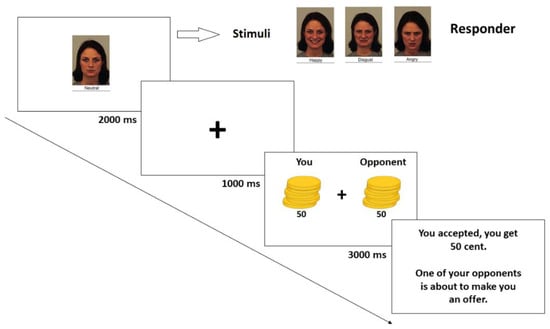The first Ultimatum Game (UG) was developed forty years ago as a stylized representation of the final step of a negotiation, from Güth, Schmittberger and Schwarze []. In the UG, one player (proposer) plays he first move and proposes how to allocate a given amount of money in an anonymous one-shot interaction. If the other player (responder) accepts the proposal, each player receives the allocated amount of money; if he/she rejects the offer, both players receive nothing. According to the classical economic models, responders would have to accept any offer greater than 0 in order to maximize their payoff, since any offer is better than nothing, even if the offer is considered as unfair [,]. However, it was observed that participants tend to systematically reject unfair offers, namely those below the 30% of the total given amount of money [,], preferring to earn nothing rather than accepting an unequal distribution of resources.