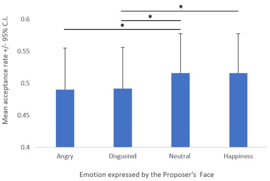 Main effect of the emotion expressed by the proposer’s face on the mean acceptance rate. Asterisks (*) indicate significant post hoc comparisons.