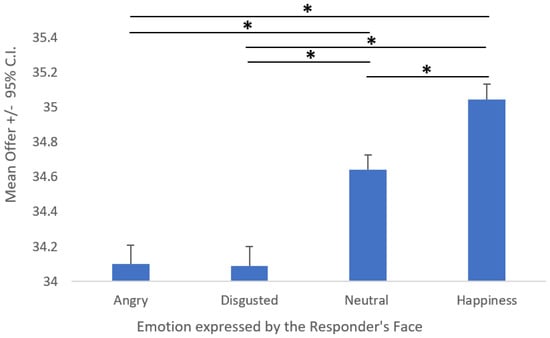 Main effect of the emotion expressed by the responder’s face on the proposer’s average offer. Asterisks (*) indicate significant post hoc comparisons.