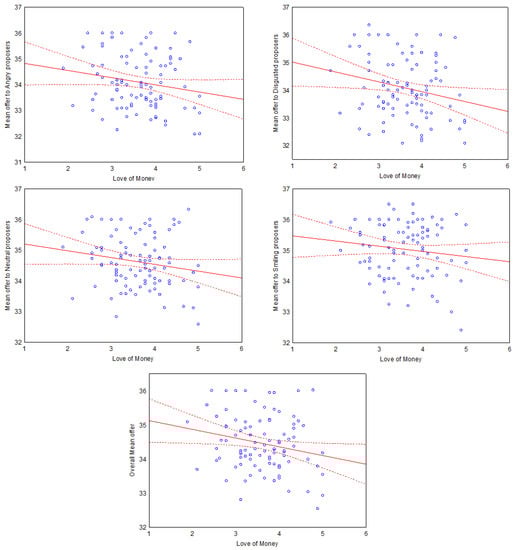 Correlation between Love of Money score and mean offer in different proposers’ emotional conditions. From top left: anger, disgust, neutral, happiness and overall mean offer. Dashed lines denote 95% confidence interval.