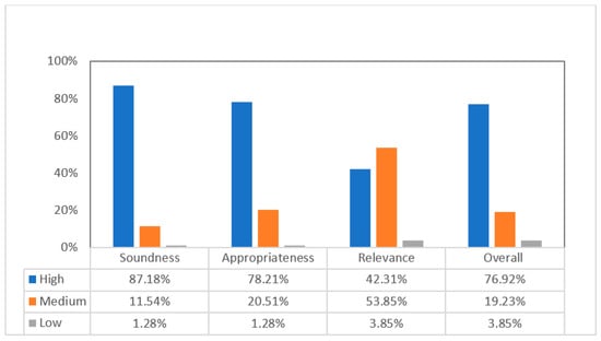Figure 1 shows that, of the 78 studies, 87.18% were judged as having a high level of soundness, 11.54% a medium level, and only 1.28% a low level of soundness. This shows that the overall trustworthiness of the selected studies in this review is very high. Only 1.28% of the selected studies adopted research methods that we judged as having low appropriateness, and 20.51% as fairly appropriate. Most of the studies (i.e., 78.21%) were judged as highly appropriate for answering the current systematic review RQs. Regarding relevance, 42.31% studies were judged at high level and 53.85% at medium level, leaving only 3.85% at low level. This indicated that the research topics of the selected studies were indeed of interest to this review. Hence, we concluded that 96.15% of the 78 studies were able to make a strong contribution to this review’s research questions.