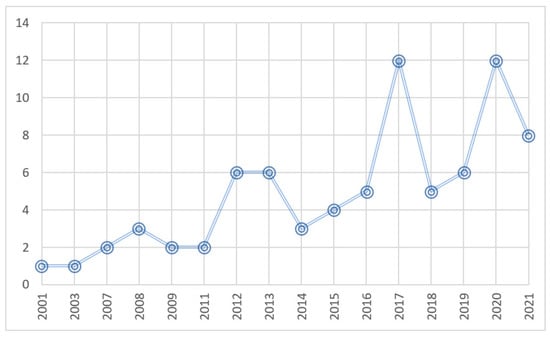 Studies about the ILH and L2 vocabulary learning are steadily growing, with an increase of 23.78% studies per year. As shown in Figure 2, the majority of studies have been conducted from 2017 onward, increasing by more than one-half (k = 43) of the total studies (k = 78). This indicates that the ILH is a rapidly growing research topic.