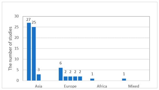 Based on our findings, the ILH as related to vocabulary learning had been studied across a broad geographic area (Figure 3). The 78 studies we selected were carried out in 26 countries from three continents: Eurasia (88.46%, n = 69) [i.e., Asia (70.51%, k = 55), Europe (17.95%, k = 14)], North America (8.97%, k = 7), and Africa (1.28%, k = 1). One study was classified separately as “mixed” because ILH tasks were completed online, and participants were from all over the world. Most of the studies were from Asia, particularly West Asia (31.62%, k = 27,) and East Asia (32.05%, k = 25). Southeast Asian countries were the least represented (3.85%, k = 3). Interestingly, there were no such studies in Central or South Asia. Iran (25.64%, k = 20), Greater China (23.08%, k = 18), and the United States (5.13%, k = 4) had the most ILH publications. The 14 studies conducted in Europe were relatively evenly distributed across regions of Europe, except for Western Europe (7.69% k = 6). There were two studies (2.56%) each in Southern Europe, Central Europe, Eastern Europe, and Northern Europe. All seven (8.97%) of the North American studies were conducted in either the United States (5.13%, k = 4) or Canada (3.85%, k = 3). The only African study came from Egypt (1.28%, k = 1).