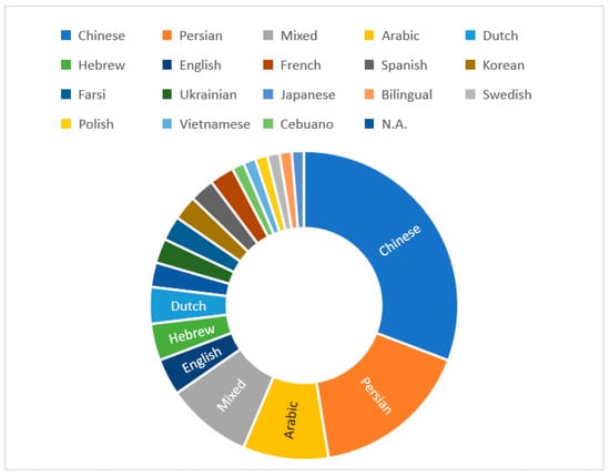 Among the 78 studies included in the analysis, participants spoke 17 different L1s, with Chinese (30.77% k = 24), Persian (16.67%, k = 13), and Arabic (8.97%, k = 7) being the top three (see Figure 4). The L1 analysis also showed a prevalence of mixed L1 backgrounds (8.97%, k = 7). Moreover, two studies were coded as “not available (N.A.)” because the original authors did not provide this information.