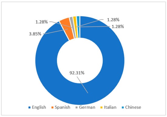 The same simple statistical analysis was used to analyze the targeted L2s. Figure 5 shows an overview of the targeted languages of the 78 selected studies. We found that the ILH was not only applied to the vocabulary acquisition of English as a Second Language (ESL) or foreign language (EFL), but was also applied to other languages learned as L2s. Although most of the selected studies focused on English (92.31%, k = 72), three studies (3.85%) focused on Spanish, one (1.28%) focused on German, one (1.28%) focused on Italian, and one (1.28%) focused on Chinese.