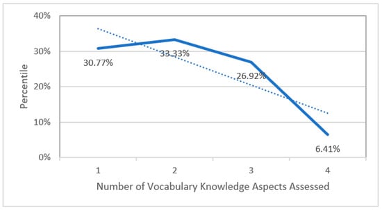 As shown in Figure 6, we found a linear trend: 24 (30.77%) studies focused on the effect of vocabulary learning tasks on one aspect of knowing a word, 26 (33.33%) on two aspects, 21 (26.92%) on three aspects, and only 5 (6.41%) on four aspects.