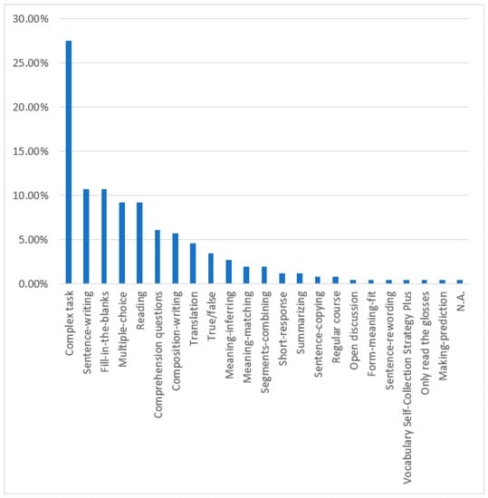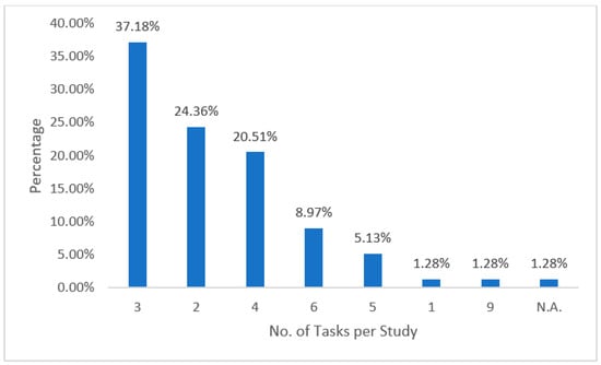 Their most common practice was to compare and evaluate two to four different tasks in one study. One interesting finding was a single study (1.28%, k = 1) in which researchers compared and evaluated nine different learning tasks []. In another study (1.28%, k = 1), researchers gave an in-depth evaluation of just one task []. A further 24.36% of the studies included two different tasks, 37.18% included three different tasks, 20.51% included four different tasks, 5.13% included five different tasks, and 8.97% included six different tasks. In addition, in one study (1.28%, k = 1), the researchers did not describe the task.
