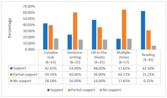The most frequent was the complex task type, combining several individual tasks into one task (See Figure 10). A total of 72 different complex tasks were used in 33 studies. Most of the studies showed that complex tasks support (42.42%, k = 14) or partially support (39.39%, k = 13) the predictability of the ILH. Although 81.82% of the 33 studies showed how their findings provided support to the predictions of the ILH, 18.18% (k = 6) of the studies found that the predictions were not supported. The next most common high-frequency task types included: sentence-writing, fill-in-the-blanks, multiple-choice, and reading. A total of 28 different sentence-writing tasks were used in 25 studies. Most of the studies showed that sentence-writing tasks provided at least some support for the predictability of the ILH. In contrast, four studies (16%) showed that learners in the high-IL task groups did not learn the L2 vocabulary more effectively than learners in the low-IL task groups. Likewise, a total of 28 different fill-in-the-blank tasks were used in 25 studies. Most of the studies showed that fill-in-the-blank tasks support (48.00%, k = 12) or partially support (36.00%, k = 9) the predictability of the ILH. Again, four studies (16%) reported contradictory results. Seventeen studies included at least a multiple-choice task, similar to the sentence-writing tasks, with more studies (64.71% k = 11) partially supporting the ILH than fully supporting the ILH (17.65%, k = 3). In addition, three studies (17.65%) did not support the ILH. Of the 16 studies that included a reading task, 10 studies (62.50%) confirmed the ILH’s prediction, 5 studies (31.25%) provided partial evidence for it, and 1 study (6.25%) failed to support it.