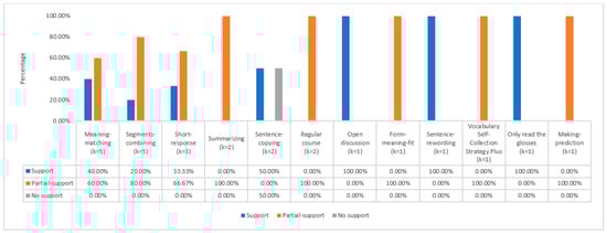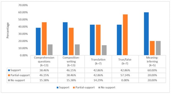 The medium-frequency task types included five task types: comprehension questions, composition writing, translation, true/false, and meaning-inferring. Most studies involving these types of learning tasks provided solid supporting evidence for the ILH (see Figure 11). A total of 16 different comprehension question tasks were used in 13 studies, with 5 studies (38.46%, k = 5) supporting the ILH, 6 studies (46.15%, k = 6) partially supporting the ILH, and 2 studies (15.35%, k = 2) not supporting the ILH. Meanwhile, the composition-writing tasks also showed very similar results, except that the number of studies partially and fully supporting the ILH was reversed. A total of 12 translation tasks were used in seven studies. Three studies (42.86%) confirmed the ILH’s prediction, three (42.86%) partially confirmed it, and one (14.20%) did not support the ILH. Interestingly, although there was only a small number of true/false tasks (k = 9) used for seven studies, all of those studies provided positive evidence for the ILH predictions. For the meaning-inferring tasks, a total of seven tasks were used in five studies. Unlike the previous task types, only 80% (k = 4) of meaning-inferring tasks provided positive support for the predictability of the ILH.