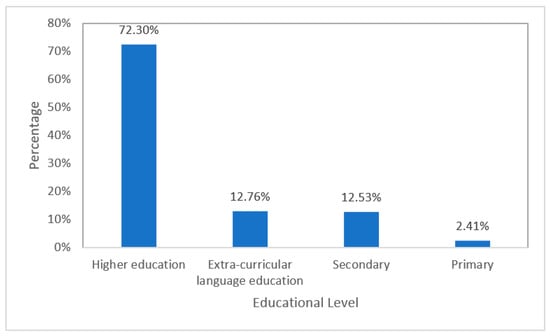 Further analysis showed that the participants in these studies varied in education level and age. The 78 studies involved a total of 6805 participants, including 4920 (72.30%) from higher education, 868 (12.76%) from extra-curricular language education, 853 (12.53%) from secondary education, and 164 (2.41%) from primary education. This suggests that ILH research in primary education is still in its infancy (see Figure 13 below).