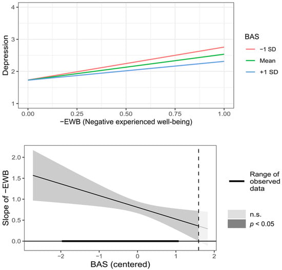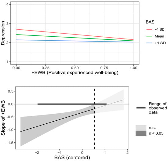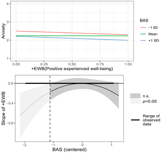 Regarding the moderation of the relationship between +EWB and −EWB, and anxiety, when comparing the linear moderated regression model with the original model, there was no significant difference (F (6, 572) = 1.018, p = 0.41). Then, it was taken into account that the graphic exploration of these effects revealed that the moderation of BAS and RC was not linear: A distinctive U-shaped curve was detected in the effect of RC in the relation between −EWB on anxiety, and an inverted U-shaped curve in the effect of BAS in the relation between +EWB on anxiety. Therefore, the polynomial in degree two (quadratic) for BAS and RC was added to the moderated regression model, and this model did show a significant change compared to the model with linear moderation (F (6, 566) = 3.277, p = 0.003). As shown in Figure 5, for all viable RC values, the direct relationship between −EWB and anxiety is significant. When RC decreases below the mean, the relation between −EWB and anxiety becomes stronger, but the relation between −EWB and anxiety is nearly the same for values of RC near and higher than the mean. In the case of BAS, as shown in Figure 6, the region of no significance starts at 1.83 and ends at 4.39; so, for BAS lower than 1.83 (8.12% of the sample), there is a significant inverse relation between +EWB and anxiety; between 1.83 and the mean of BAS (2.94), the relation tends to zero and for values higher than the mean, the relation becomes stronger, but not enough to be outside the region of no significance. Therefore, regarding the moderating effect on the relationship between −EWB and +EWB, and anxiety, the hypotheses H7.1 and H8.2 were supported, and the hypotheses H7.2, H7.3, H8.1, and H8.3 were not supported.