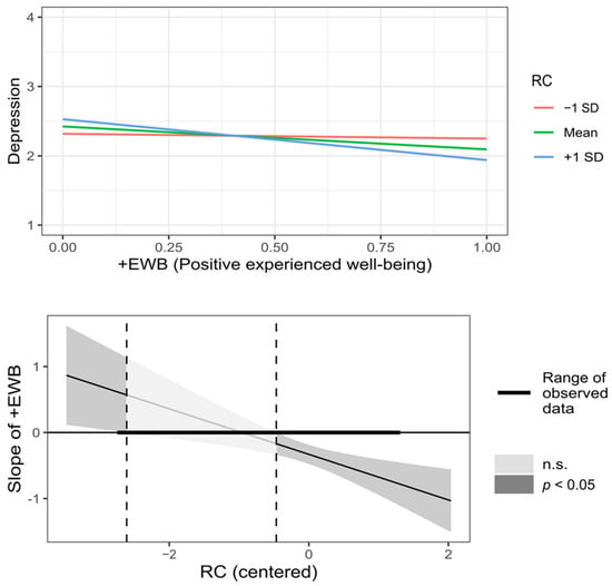 As shown in Table 2 (moderated), BAS significantly moderated the relationship between −EWB and depression symptoms. In this case, the relationship was positive for all BAS values, so as control beliefs increased, decreased the relationship between −EWB and depression symptoms (see Figure 2). On the other hand, BAS and RC significantly moderated the relationship between +EWB and depression symptoms. Here, for all BAS values, the relationship between +EWB and depression symptoms was inverse; that is, as BAS increased, the strength of that relationship decreased (see Figure 3). Additionally, when RC was low (less than one SD), the effect of +EWB on depression symptoms was near zero; as RC increased, the reverse relationship became progressively stronger (see Figure 4). The moderating effect on the relationship between −EWB and +EWB, and depression symptoms, support the hypotheses H5.2, H6.1, and H6.2, whereas hypotheses H5.1, H5.3, and H6.3 were not supported.