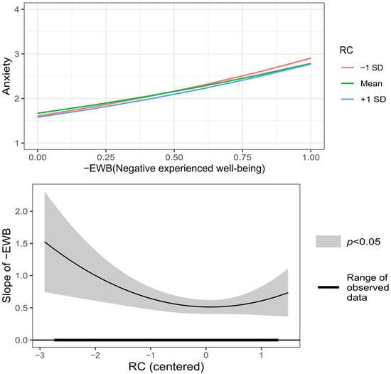 Graphic representation of RC (Resilient coping) moderation on the relationship between −EWB (Negative experienced well-being) and anxiety symptoms.