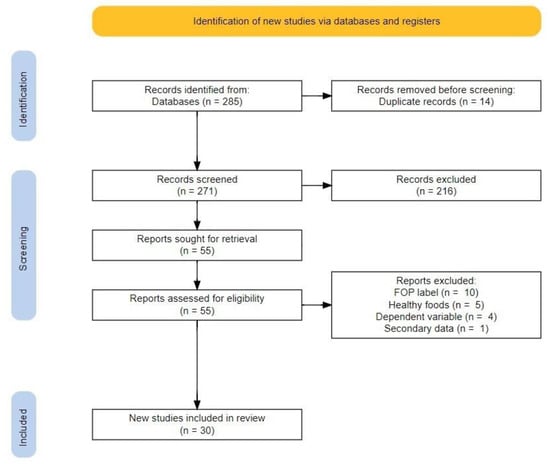 A visual representation of the study selection process is shown in Figure 3. The search strategy resulted in the identification of 285 records. Fourteen of them were duplicates. They were removed. Two hundred and seventy-one were screened based on the first screening criteria, and 216 records were excluded for not meeting the criteria. All remaining 55 reports were sought for retrieval and assessed for eligibility. Out of those, a total of 25 reports were excluded based on the final eligibility criteria, as 10 of the reports did not investigate FOP food labels as defined in this review, five of the reports did not investigate behaviors related to healthy foods, four of the reports did not investigate the dependent variable specified in this review, and one report did not use primary data collection. This resulted in a total of 30 articles included in this review [15,33,48,49,50,51,52,53,54,55,56,57,58,59,60,61,62,63,64,65,66,67,68,69,70,71,72,73,74,75].