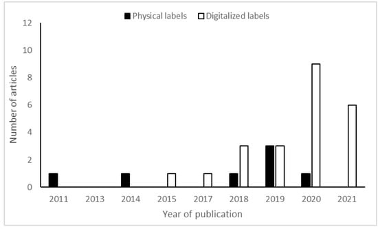 The number of articles that have investigated either physical and digitalized FOP food labels and the year of publication is shown in Figure 4. The figure shows that the number of articles investigating digitalized FOP food labels increased steadily from 2011 to 2019 and that digitalized FOP food labels were higher in 2020 and 2021 than were physical FOP food labels.