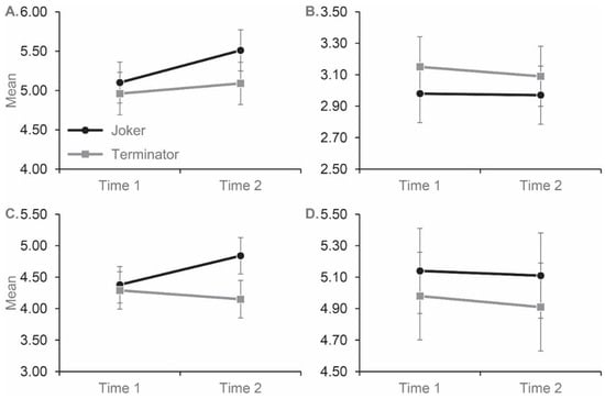 Mean scores for participant in the experimental (Joker) and control (Terminator) conditions on the fear/avoidance (A), malevolence (B), authoritarianism (C) and unpredictability (D) subscales of the PPMI. The subscales were completed before (Time 1) and after (Time 2) each film. A total of 81 participants viewed Joker, and 80 viewed Terminator. Error bars represent ± standard error of the mean.