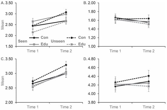 Mean scores for participants in the control (i.e., Joker without educational statements) and education (i.e., Joker with educational statements) conditions on the fear/avoidance (A), malevolence (B), authoritarianism (C) and unpredictability (D) subscales of the PPMI. The subscales were completed before (Time 1) and after (Time 2) each film. A total of 80 participants viewed the control version of Joker, and 91 viewed Joker with the educational statements. ‘Seen’ refers to participants that had previously seen Joker, ‘Unseen’ refers to participants that had not previously seen Joker. Error bars represent ± standard error of the mean.