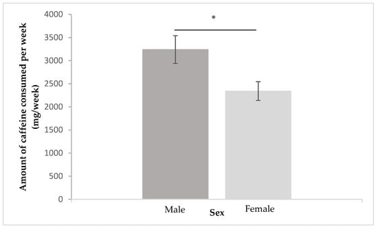Caffeine intake per week (mg/week) by sex (* p < 0.05).
