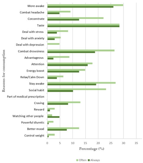 The online questionnaire incorporated two instruments reported in the literature: the Caffeine Consumption Questionnaire-Revised [], used to assess subjects’ consumption pattern and type of products consumed, and the Caffeine Motives Questionnaire, used to evaluate the motives that lead to that consumption [].