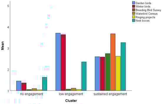 The engagement clusters can be labeled according to the engagement in the CS program, with cluster 1 as no engagement (N = 992), cluster 2 as low engagement (N = 1058), and cluster 3 as high or sustained engagement (N = 806). Participants from the low engagement group participated in the garden and winter birds counts, but at a significantly higher level than the sustained engagement cluster. The sustained engagement cluster is classified by a sustained engagement in the more complex and enduring programs like the breeding bird survey, bird ringing schemes, and waterbird census. However, people from the higher engagement cluster showed lower investment in garden bird and winter bird counts compared to the low engagement cluster. There was a significant gender effect (chi-square test, χ = 239.814, df = 2, p < 0.001, Figure 2), with more men than women showing a sustained engagement.