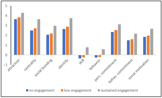 Partial eta-squares were quite high in the other dimensions, ranging from 0.098 in attraction to 0.263 in behavior and 0.306 in skill/knowledge. Post-hoc tests on the means were carried out with Bonferroni adjustments (Table 3, Figure 3). All pairwise comparisons between the high engagement cluster and the no engagement cluster were significant on the 0.001 level, as were the differences between high and low engagement clusters. There were no differences in behavior between the low and no engagement clusters (p = 0.432).