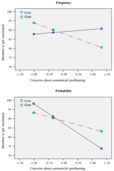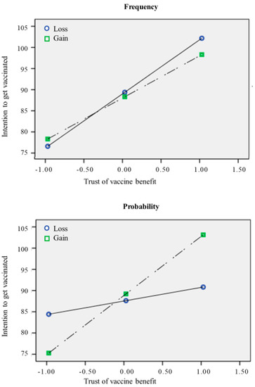 Further, this relationship is moderated by the framing used to communicate the vaccine’s effectiveness in counteracting the virus. Specifically, results reported a significant interaction between loss-gain framed messages and trust in vaccine benefit. Specifically, in the loss condition, the influence of trust in vaccine benefit on the intention of getting the vaccine was weaker compared to the gain condition. Furthermore, concerns about commercial profiteering had a more negative effect on intention when participants were exposed to a probability-framed message. This trend is coherent with previous studies, which did not find a direct effect of the frame on health choices [22], but mediating or moderating effects [28,29,30].