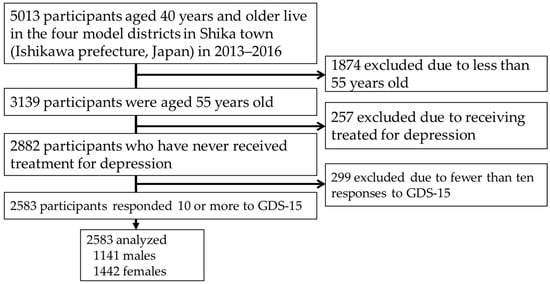 This cross-sectional study, conducted among the residents of Shika town, was termed the Shika study [18,19,20]. Participants were recruited between October 2013 and December 2016. The target population was the residents of Shika town, Ishikawa Prefecture, Japan (population, 21,301, males, 10,111, females 11,190, number of individuals aged 65 years and older on 1 December, 2016, 8498 (aging rate 39.9%) [21]. Shika town has a slightly older population than the national average, with no substantial variation in population composition or sex ratio, making it a representative epidemiological population of rural Japan [22]. Five thousand one hundred and thirteen residents aged 40 years and older live in the four model districts (Horimatsu, Higashimasuho, Tsuchida, and Togi districts). Written informed consent was collected from all 5013 participants. Of these, 3139 participants were aged 55 years. We excluded 257 participants because they were receiving treatment for depression, in addition to 299 who had fewer than ten responses to the Geriatric Depression Scale 15 (GDS-15). Therefore, 2583 participants (1141 males and 1442 females) were included in this analysis (Figure 1).