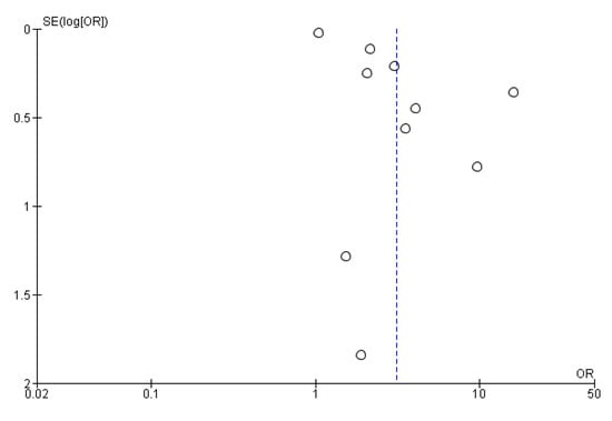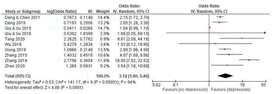 Among eighteen included studies, ten studies involving 11,437 subjects reported an association between QSC and depression. The random effects model was used because the statistical heterogeneity of the included studies was significant (I2 = 94%). The results showed that the association between QSC and depression was significant, with a pooled OR and 95% CI of 3.12 [1.80–5.40] (see Figure 2).