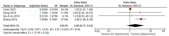Four studies with a total of 2910 subjects reported an association between YADC and depression. The random effects model was used because the statistical heterogeneity of the included studies was significant (I2 = 81%). The results showed that the association between YADC and depression was significant, with a pooled OR and 95% CI of 1.89 [0.71–5.03] (see Figure 4).
