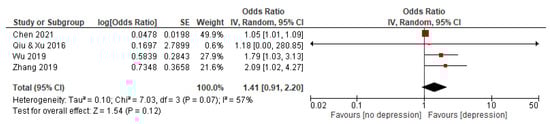 Four studies with a total of 2992 subjects reported an association between YIDC and depression. The random effects model was used because the statistical heterogeneity of the included studies was significant (I2 = 57%). The results showed that the association between YIDC and depression was significant, with a pooled OR and 95% CI of 1.41 [0.91–2.20] (see Figure 5).
